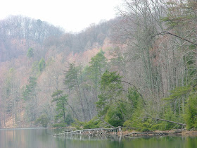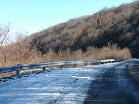 The ride was quite unremarkable, except the roads were a tad bit slippery at this altitude. That I knew was only a prelude to what I could expect as I ascended Roan MT. especially on the north face of the mountain, where the sun rarely shone, or where the pines were thick, rather than the hardwoods whose dressings had come and gone for the winter months. I wasn't sure exactly how bad, or good the road would be ahead, but I've seen it covered in ice sheets before...so I wasn't gonna try out ride my line of sight today!