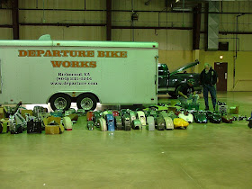 I'm up the next morning before 6AM. I wanted to get dressed and get outta there by 6. I also wanted to stay the night one more night, so I thought better than to crank up my bike at 6AM on a Sunday morning, I waited until 7AM. I once more jumped on I-81 north, making my way up to Fishersville and the Expo building. I pulled in behind a truck pulling a trailer loaded with bike parts. The parts were loaded up to the gunwales…I figured he was headed to the swap meet. I figured right. He led me right to the back door, I followed him in and found Brenda from Departure Bike Works, introducing myself to her, we got on friendly footing and I started making my way around the building visiting the vendors who had come and set up shop or were in the process of setting up shop.